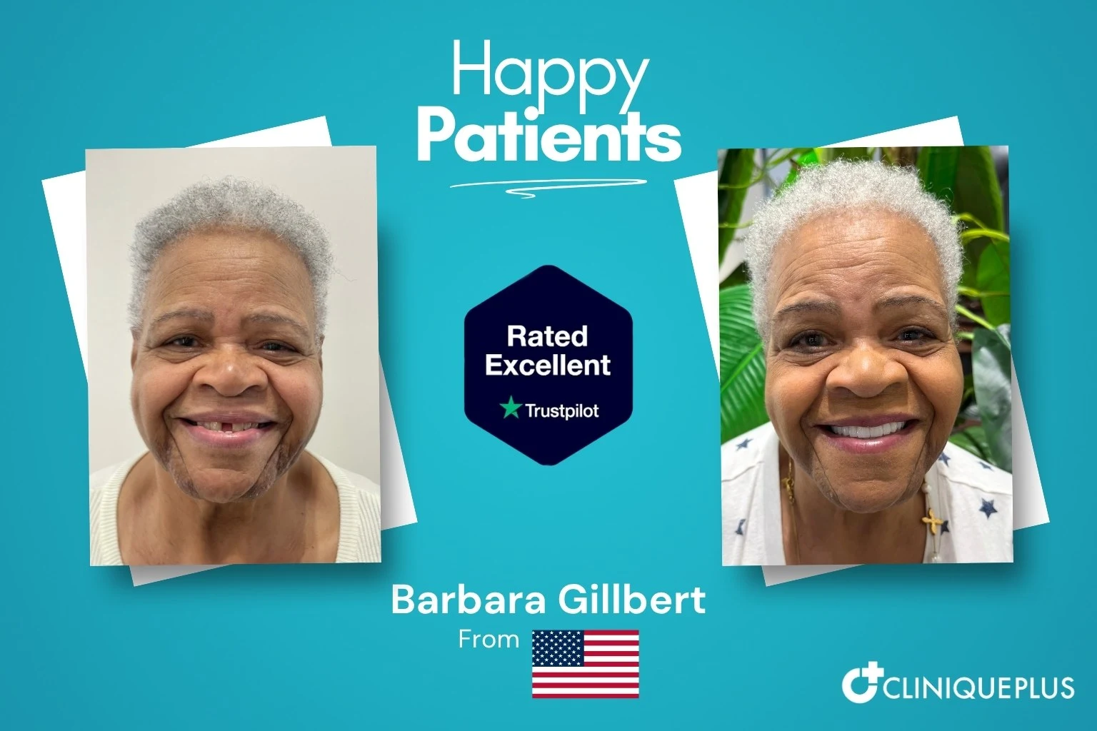 Barbara Gillbert’s dental transformation journey with CLINIQUEPLUS in Turkey.